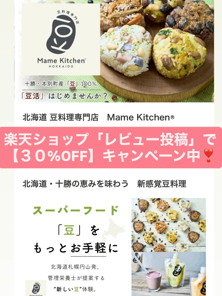 クーポンのご利用は11月末までなので、例えば、今月中に、豆おにぎり5個or10個セットをご購入&レビューで、次回、豆スムージーや、豆マフィンが【30%OFF】で、かなり!お🉐にご購入いただけるキャンペーンなのです😍